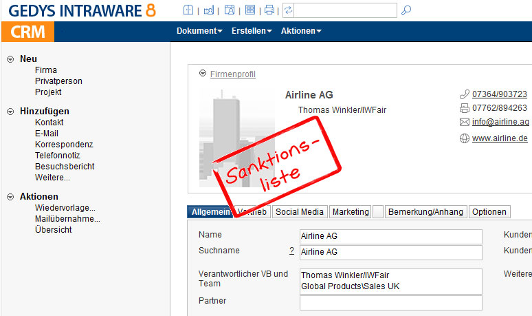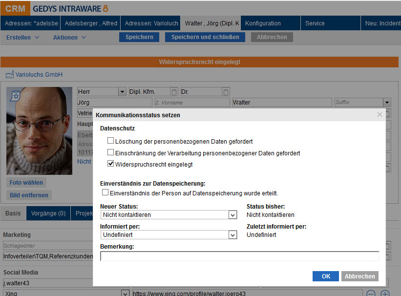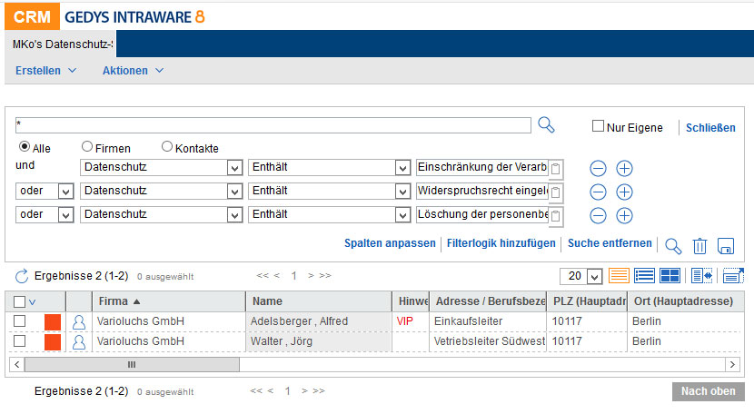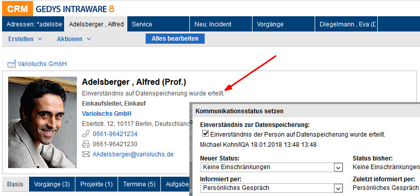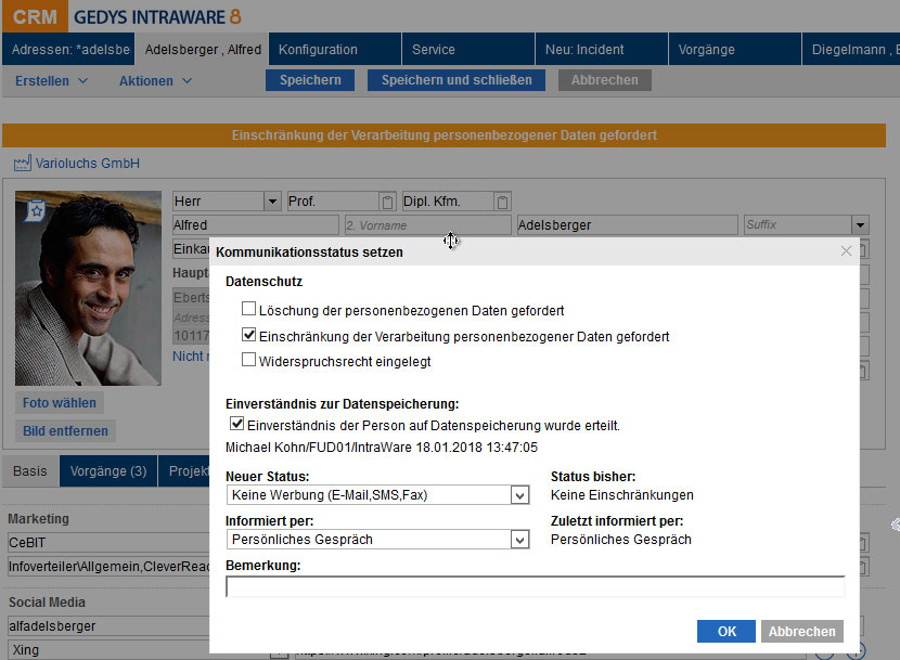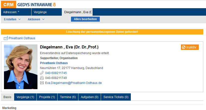 Im Rahmen der Umsetzung der EU-DSGVO wurden in GEDYS IntraWare CRM 8.9 verschiedene Erweiterungen implementiert. Die folgenden Aufgabenstellungen wurden hierbei berücksichtigt: