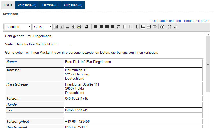Hierfür gibt es in der Version 8.9 Vorlagen, mit denen diese Auskünfte per Mausklick versendet werden können.