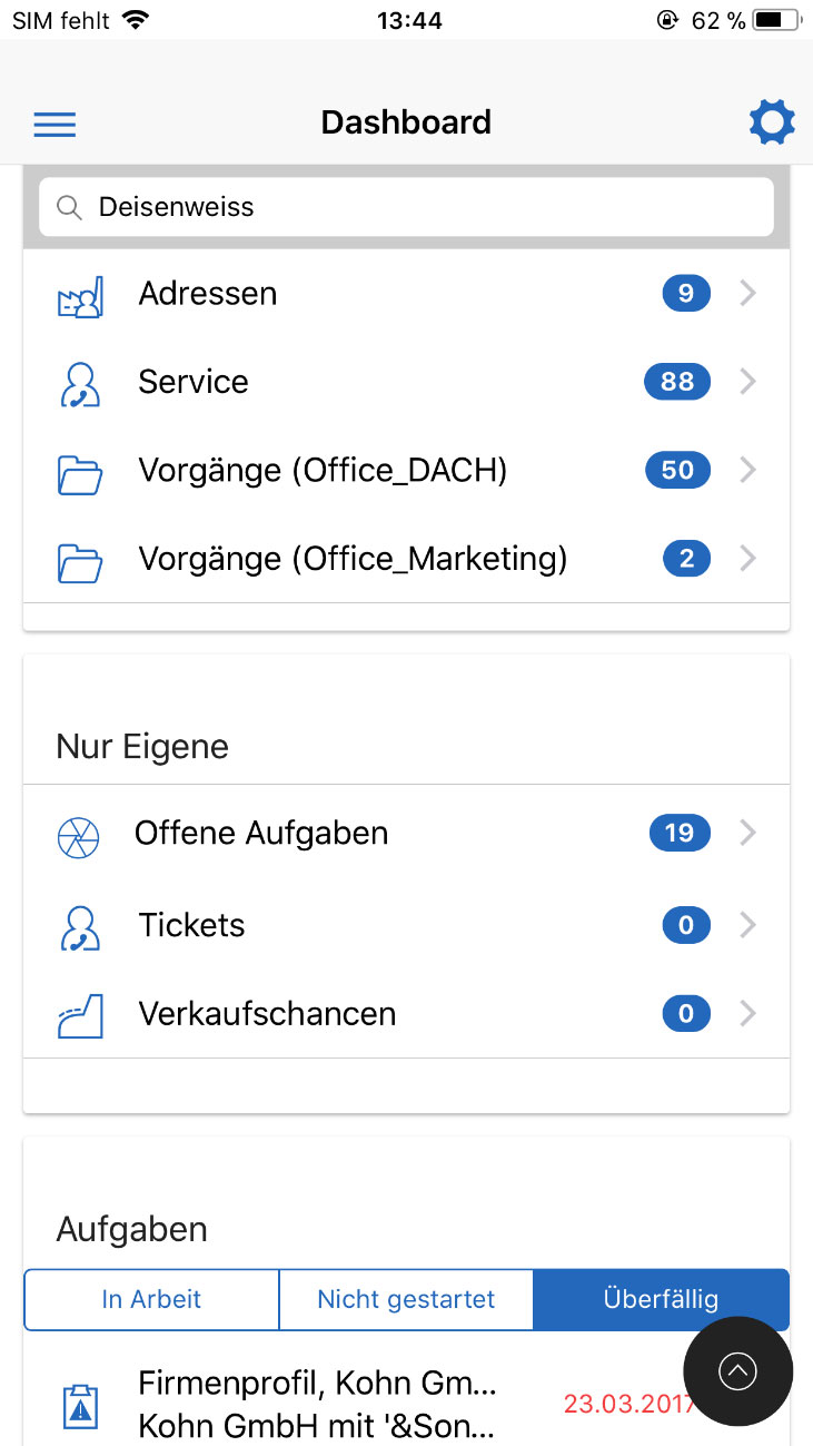 In einer komplett überarbeiteten goMobile Pro App stehen dem Anwender sehr viele Funktionen zur Verfügung, die man von einer nativen App erwartet. Der browserähnliche Look ist einer neuen App-gerechten Oberfläche gewichen. Die Bedienung der Elemente erfolgt mit Funktionen, die man in einer App erwartet. Hierzu gehören Wisch-Funktionen ebenso wie prominent platzierte zentrale Buttons mit kontextbezogenen Funktionen. Ergänzt wird diese schicke Applikation durch intelligente Dashboards, mit denen das mobile Arbeiten Spaß macht.