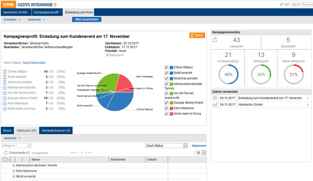 - Wie viele Adressen sind positiv abgeschlossen? Wie viele negativ? Wie viele noch in Bearbeitung?